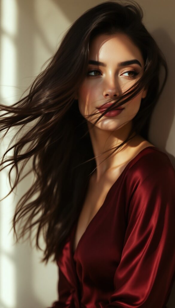 Satin Blouse with Long Sleeves & a V-Neck, in Soft Jewel Tones