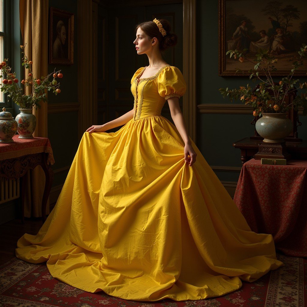 Ivory Satin Dress with Embroidery & a Yellow Sash