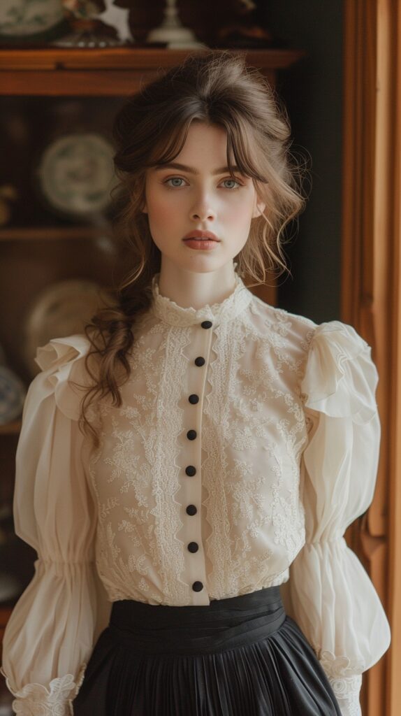 Lace Blouse with Long Sleeves and High Neckline, in White & in Neutrals