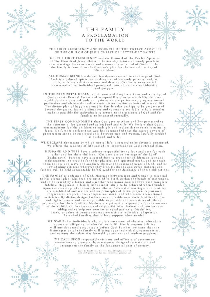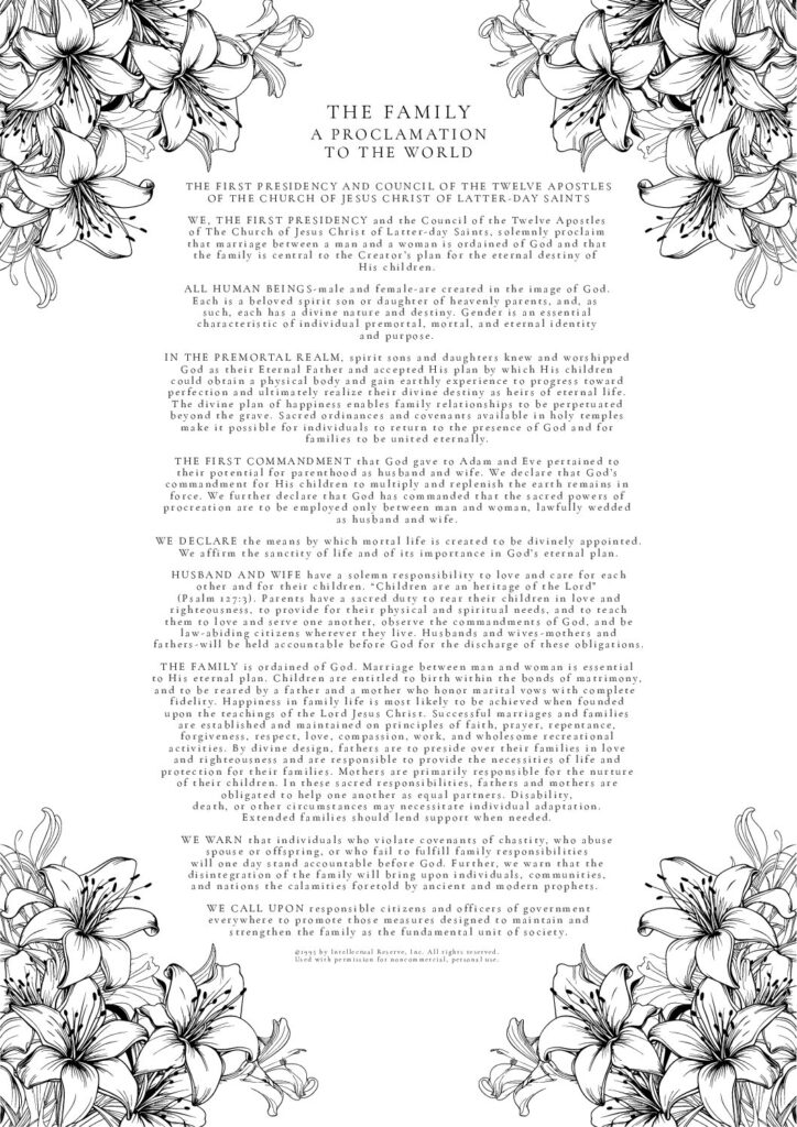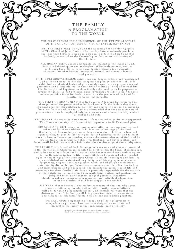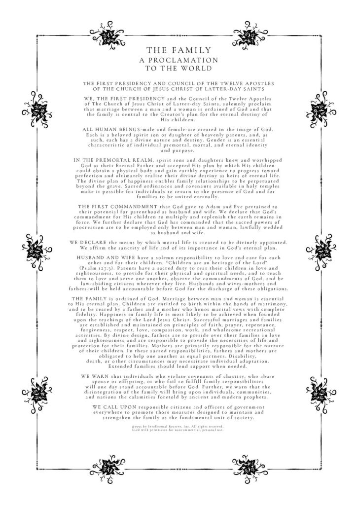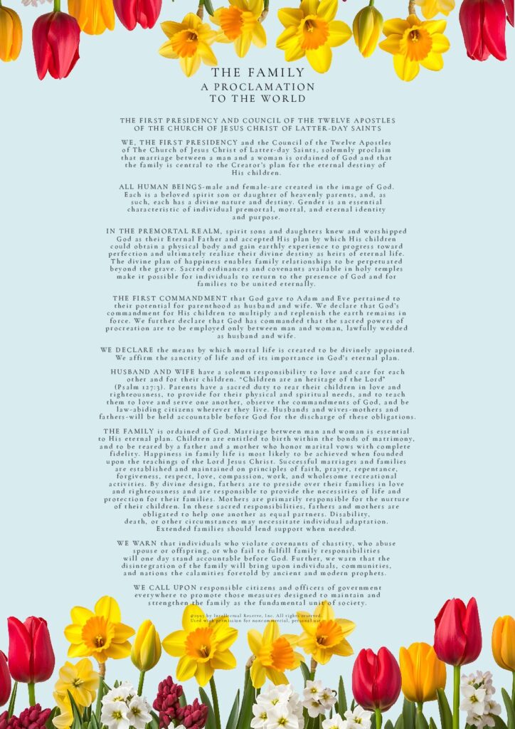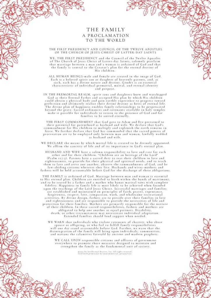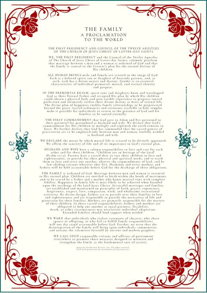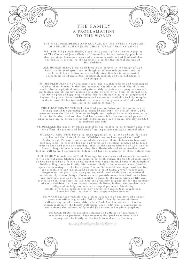 THE FAMILY: A Proclamation To The World was used by permission from The Church of Jesus Christ of Latter-day Saints. © 1995 by Intellectual Reserve, Inc. All rights reserved.