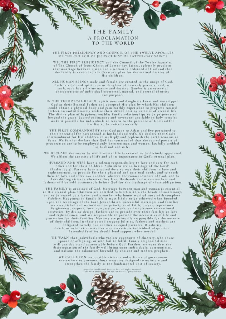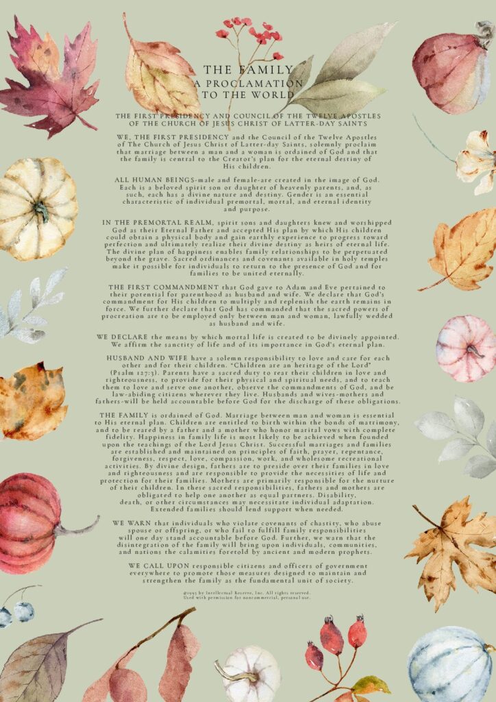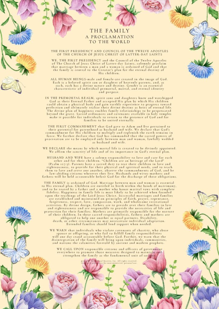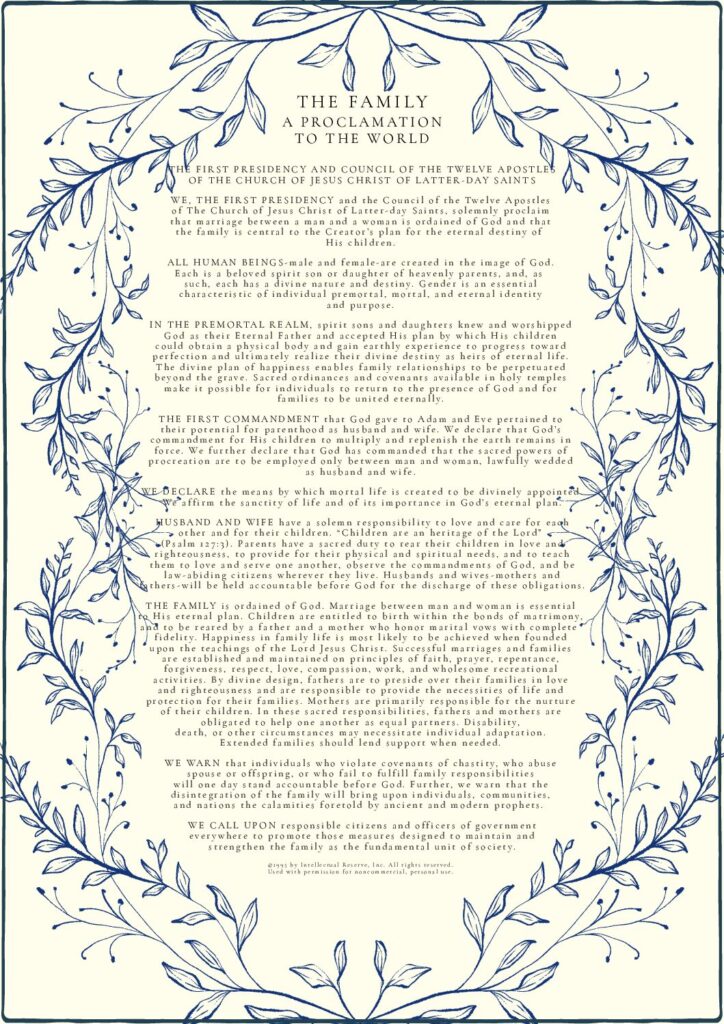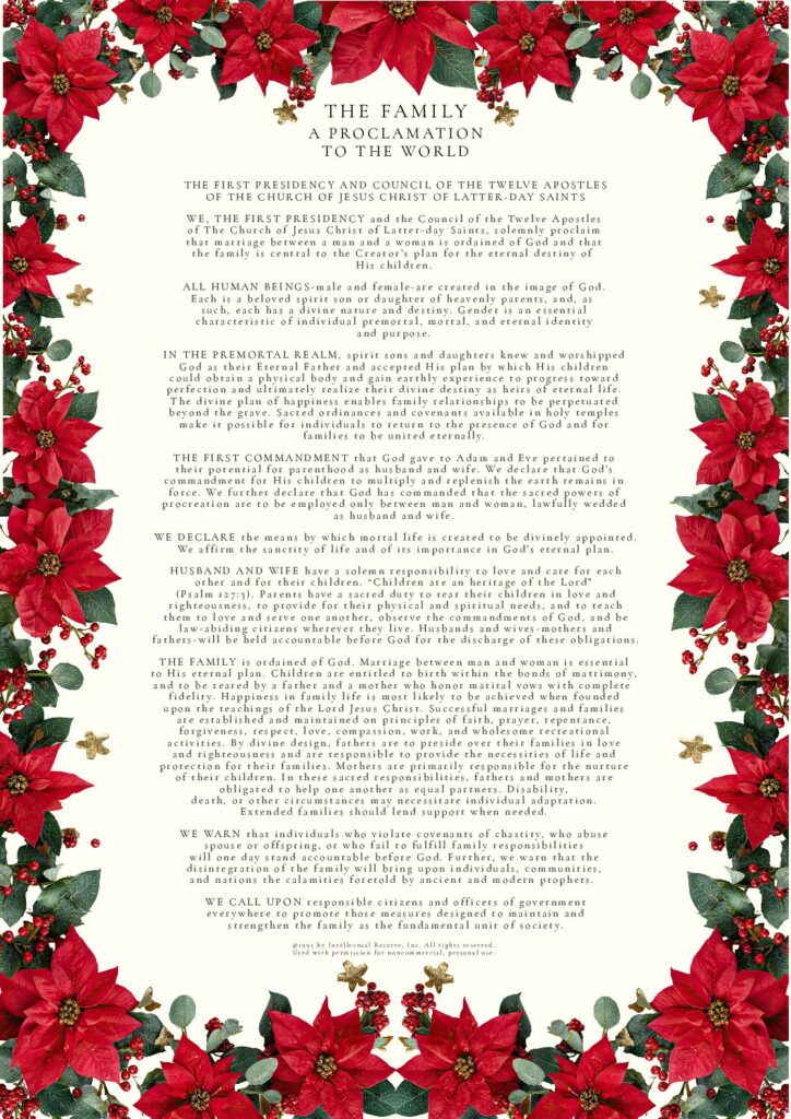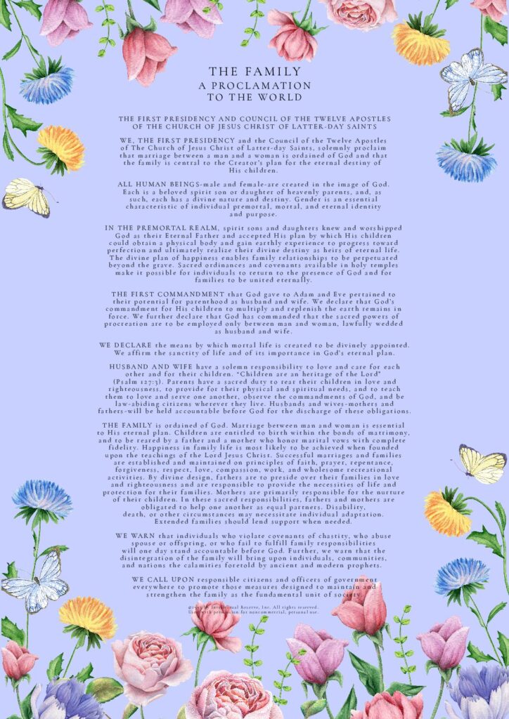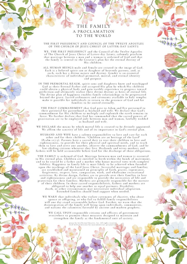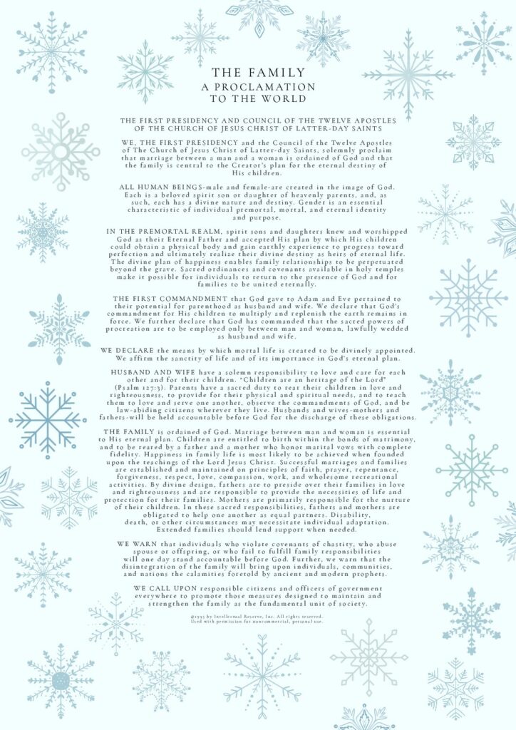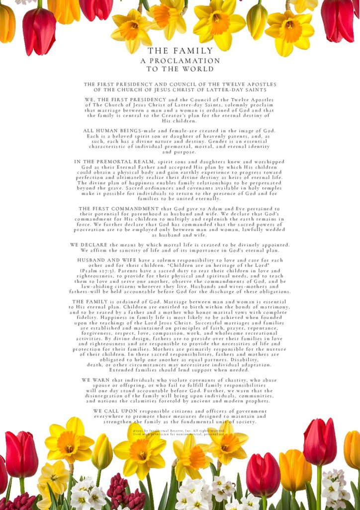 THE FAMILY: A Proclamation To The World was used by permission from The Church of Jesus Christ of Latter-day Saints. © 1995 by Intellectual Reserve, Inc. All rights reserved.