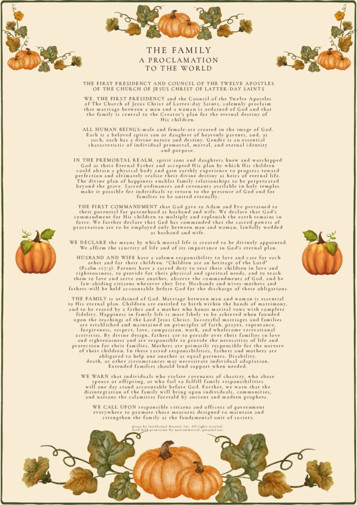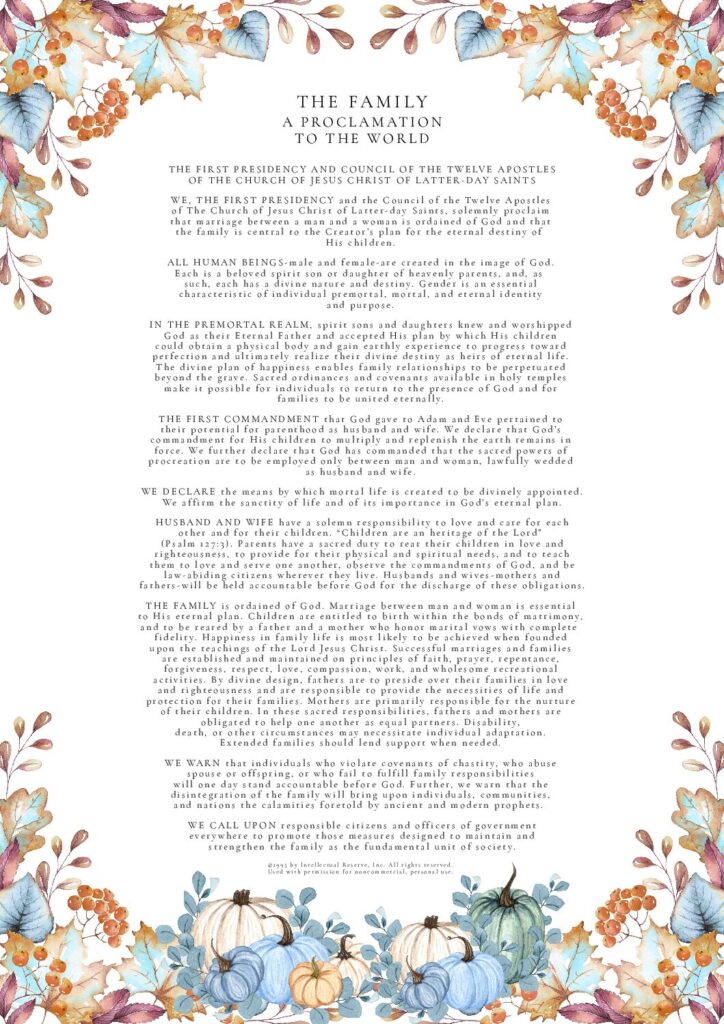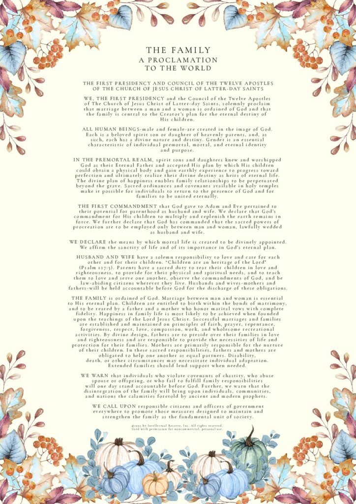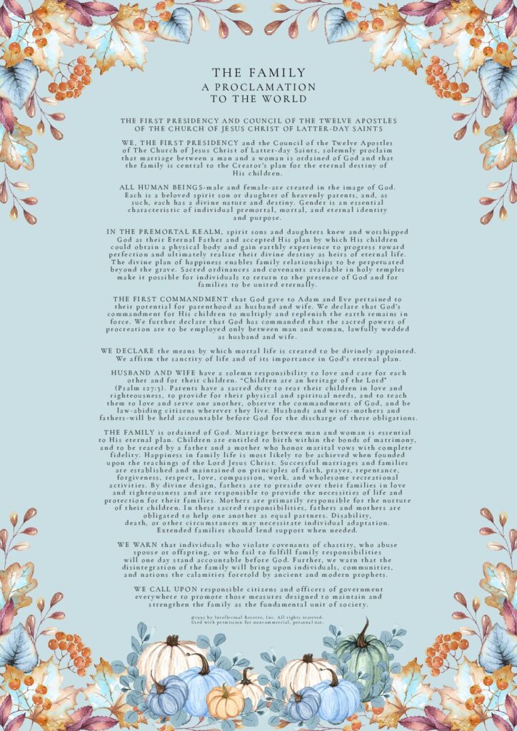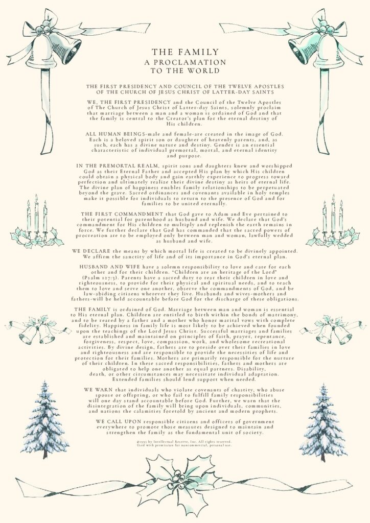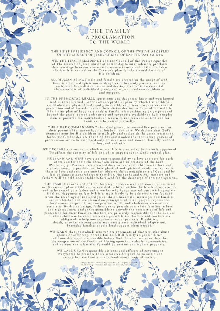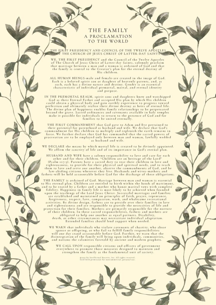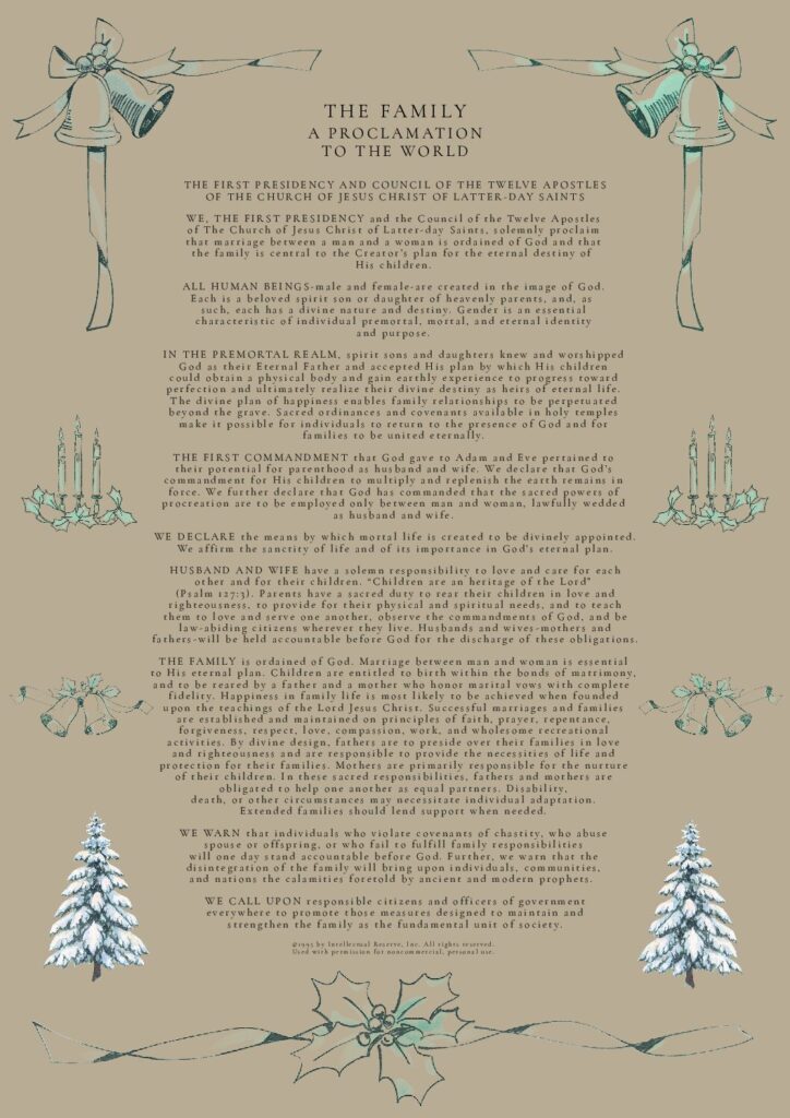 THE FAMILY: A Proclamation To The World was used by permission from The Church of Jesus Christ of Latter-day Saints. © 1995 by Intellectual Reserve, Inc. All rights reserved.